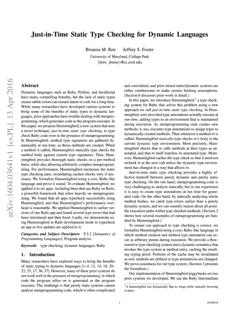 Justinian Static Type Checking for Dynamic Languages Brianna M. Jeffrey S. FosterarXiv:1604.03641v1 cs.PL 13 Apr 2016University of Maryland, College Park been, foster cs.UMD.eduAbstractand convoluted;