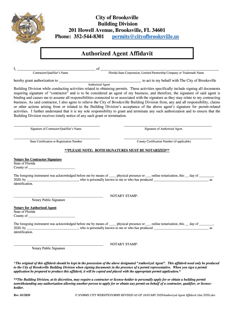 City of Brookville Building Division 201 Howell Avenue, Brookville, FL 34601 Phone: 3525448301 permits cityofbrooksville. Unauthorized Agent Affidavit I, of Contractor/Qualifiers Name Florida State