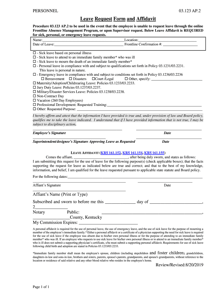PERSONNEL03.123 AP.2Leave Request Form and Affidavit Procedure 03.123 AP.2 to be used in the event that the employee is unable to request leave through the online Frontline Absence Management Program,