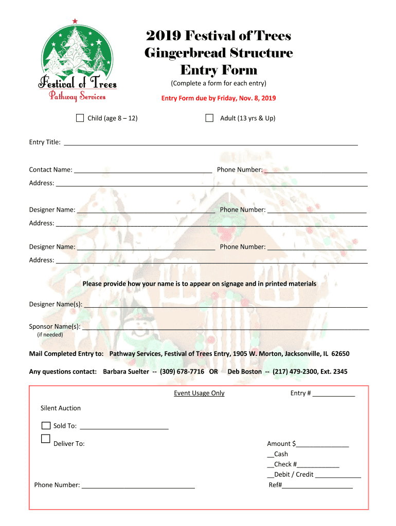 2019 Festival of Trees Gingerbread Structure Entry Form (Complete a form for each entry)Entry Form due by Friday, Nov. 8, 2019 Child (age 8 12)Adult (13 yrs & Up)Entry Title: Contact Name: Phone Number: