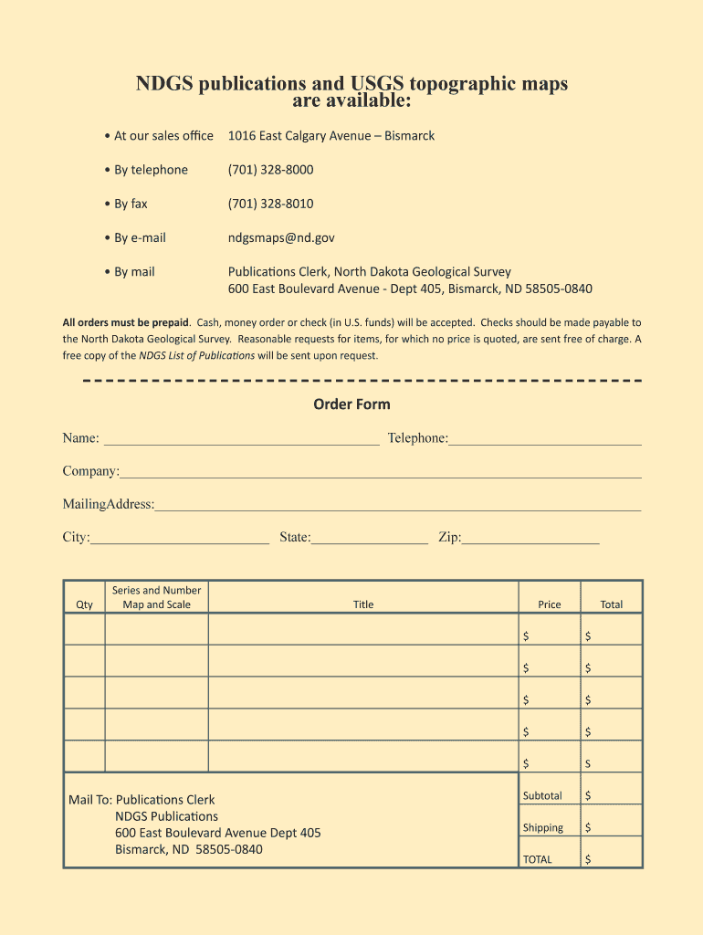 NAGS publications and USGS topographic maps are available: At our sales office1016 East Calgary Avenue Bismarck By telephone(701) 3288000 By fax(701) 3288010 By emailndgsmaps ND.gov By mailPublications
