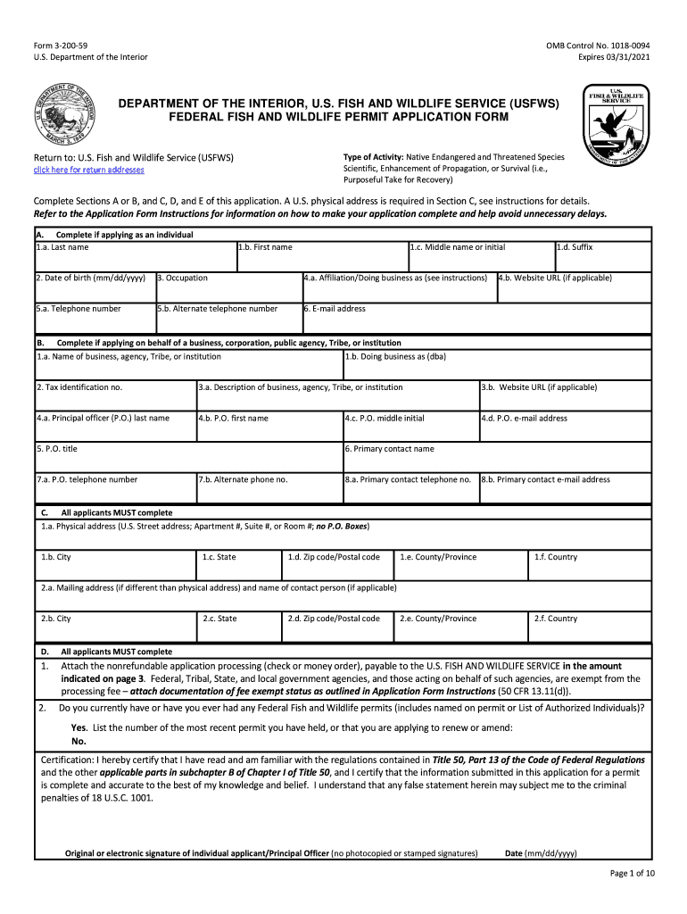FEDERAL FISH AND WILDLIFE PERMIT APPLICATION