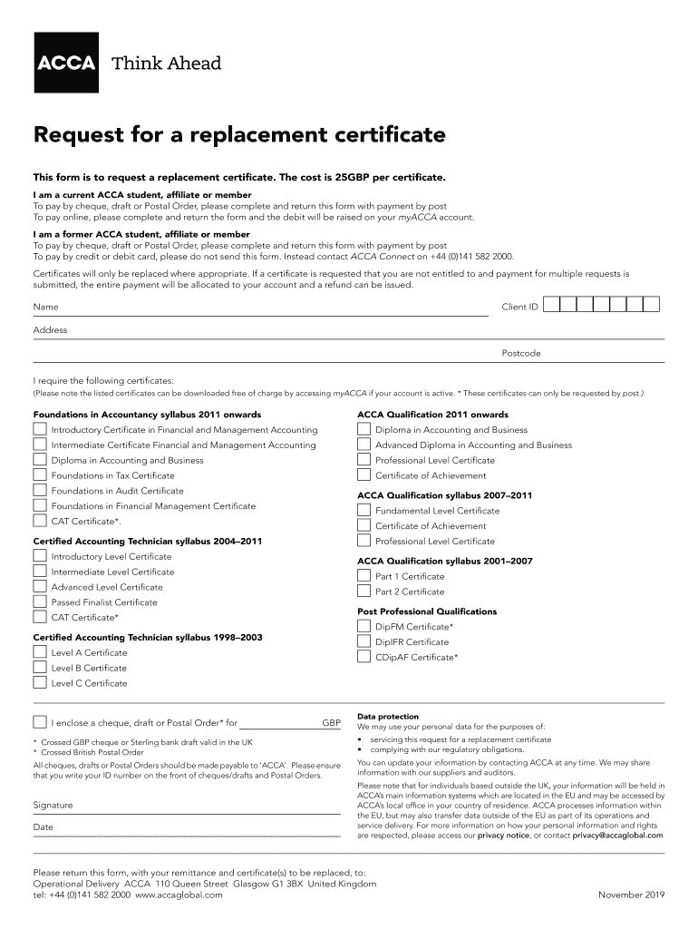 This form is to request a replacement certificate. The cost is 25GBP per certificate.