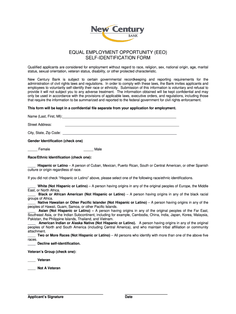 The EEO Self-Identification Form is an employment document used by applicants at New Century Bank to voluntarily disclose their race, ethnicity, gender, and veteran status for compliance with civil rights laws.