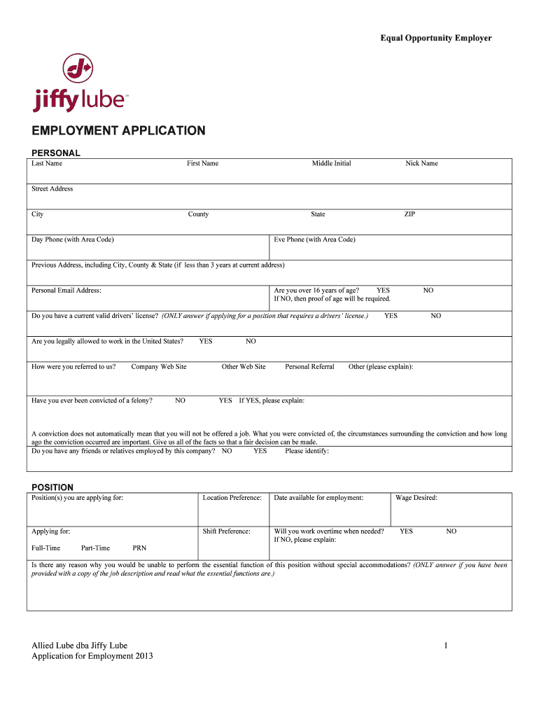 The Jiffy Lube Employment Application Form is a vital document for individuals seeking employment at Jiffy Lube. It serves to collect essential information such as personal details, employment history, and educational background from applicants. This form complies with Equal Opportunity Employer (EOE) policies, ensuring a fair hiring process for everyone.