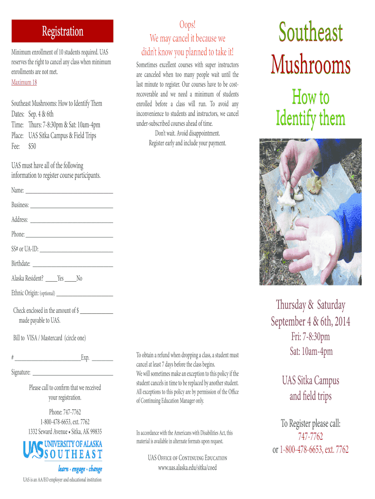 Registration Minimum enrollment of 10 students required. UAS reserves the right to cancel any class when minimum enrollments are not met. Maximum 18Southeast Mushrooms: How to Identify Them Dates:Sep.