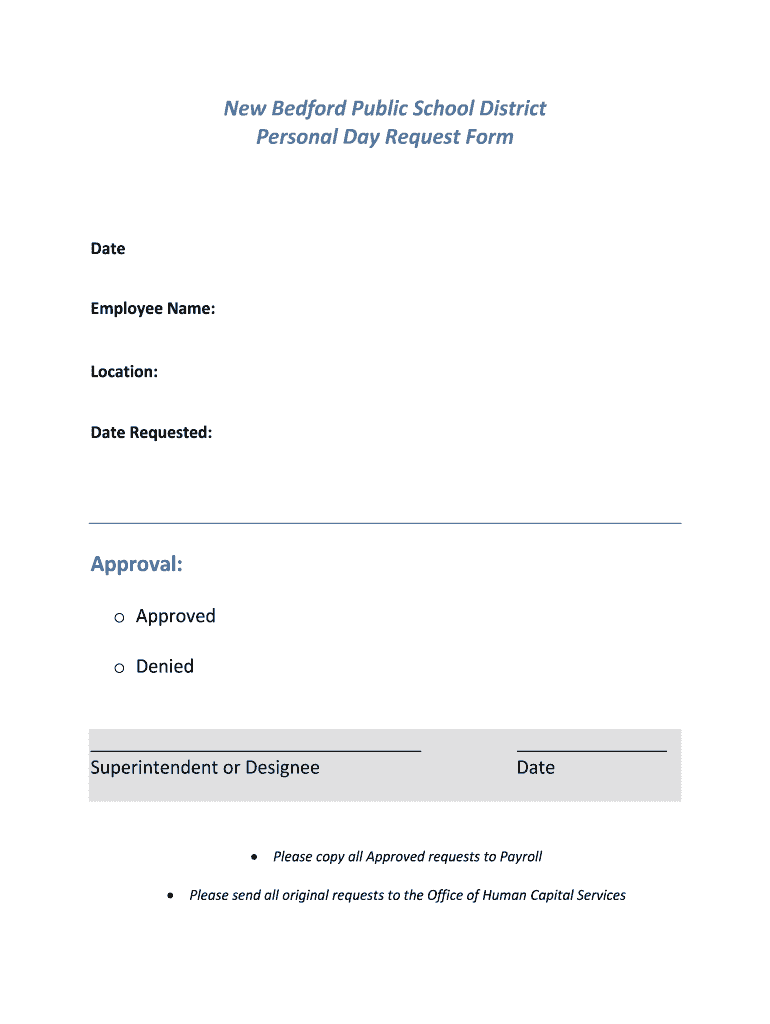 New Bedford Public School District Personal Day Request Format Employee Name: Location: Date Requested:Approval: o Approved o Denied Superintendent or Designee Displease copy all Approved requests