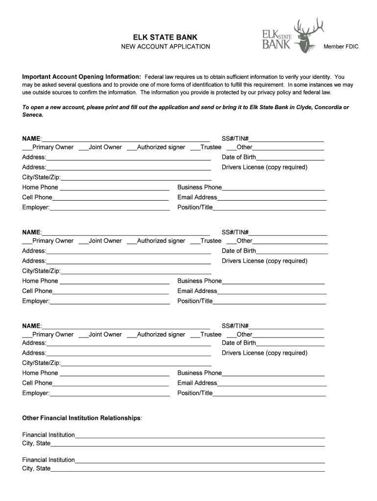ELK STATE BANNED ACCOUNT APPLICATIONMember FDICImportant Account Opening Information: Federal law requires us to obtain sufficient information to verify your identity. You may be asked several questions