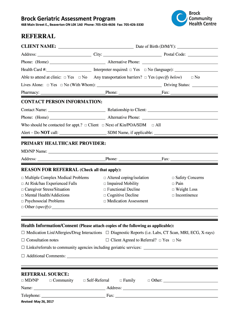 Brock Geriatric Assessment Program 468 Main Street E., Beaverton ON L0K 1A0 Phone: 7054264636 Fax: 7054263330REFERRAL CLIENT NAME:Date of Birth (D/M/Y):Address:City:Postal Code:Phone: (Home)Alternative