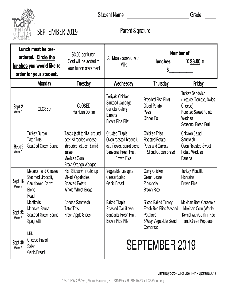 Student Name: Grade: SEPTEMBER 2019 Lunch must be preordered. Circle the lunches you would like to order for your student.$3.00 per lunch Cost will be added to your tuition statement Meals served