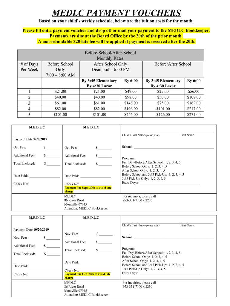 MEDIC P PAYMENT VOUCHERSBased on your children weekly schedule, below are the tuition costs for the month. Please fill out a payment voucher and drop off or mail your payment to the MEDIC Bookkeeper.