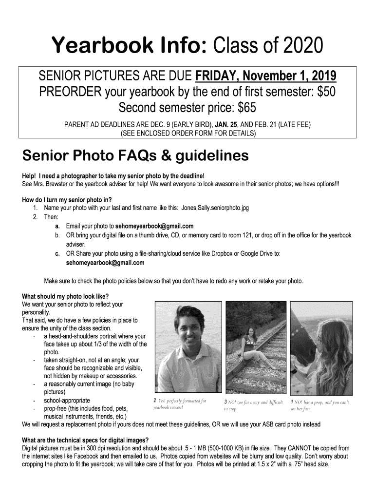 Yearbook Info: Class of 2020 SENIOR PICTURES ARE DUE FRIDAY, November 1, 2019, PREORDER your yearbook by the end of first semester: $50 Second semester price: $65 PARENT AD DEADLINES ARE DEC. 9 (EARLY