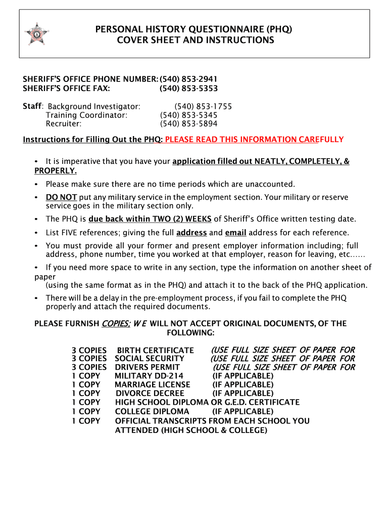 PERSONAL HISTORY QUESTIONNAIRE (PhD) COVER SHEET AND INSTRUCTIONSSHERIFFS OFFICE PHONE NUMBER: (540) 8532941 SHERIFFS OFFICE FAX: (540) 8535353 Staff: Background Investigator: Training Coordinator: