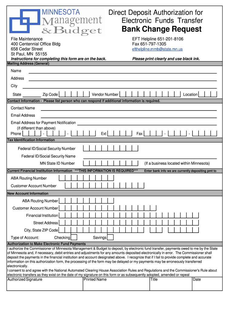 Direct Deposit Authorization for Electronic Funds Transferring Change Request File Maintenance 400 Centennial Office Bldg 658 Cedar Street St Paul, MN 55155EFT Helpline 6512018106 Fax 6517971305 helpline.MMB