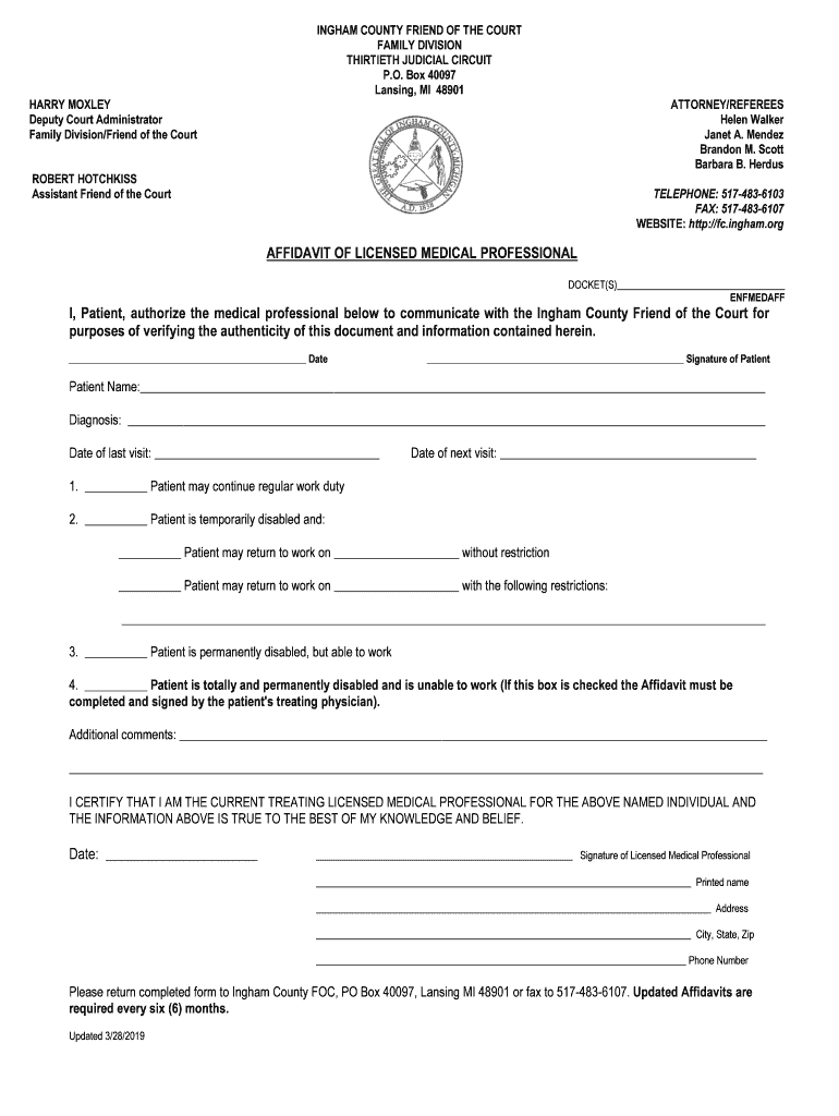 INGHAM COUNTY FRIEND OF THE COURT FAMILY DIVISION THIRTIETH JUDICIAL CIRCUIT P.O. Box 40097 Lansing, MI 48901 HARRY MORLEY Deputy Court Administrator Family Division/Friend of the CourtATTORNEY/REFEREES