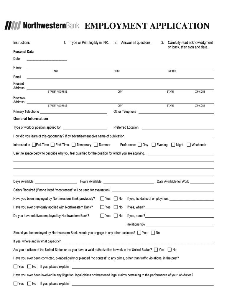 The Employment Application is a document used by Northwestern Bank to collect essential information from job applicants for hiring purposes.