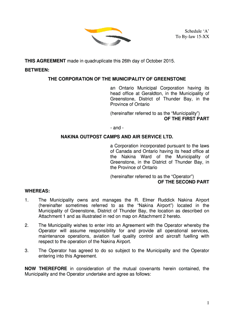 Schedule A To Bylaw 15XXTHIS AGREEMENT made in quadruplicate this 26th day of October 2015. BETWEEN: THE CORPORATION OF THE MUNICIPALITY OF GREENSTONE an Ontario Municipal Corporation having its head