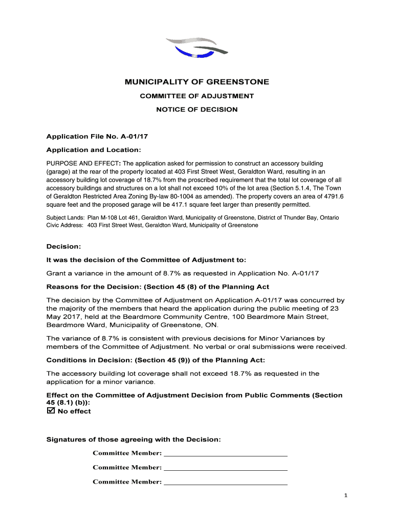 Get the free Notice of Decision If Variance Approved - greenstone civicweb