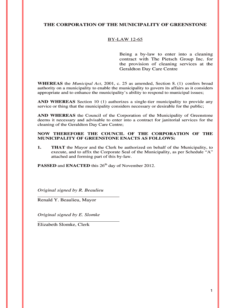 THE CORPORATION OF THE MUNICIPALITY OF GREENSTONEBYLAW 1265Being a bylaw to enter into a cleaning