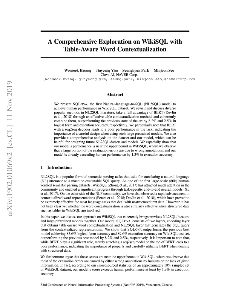 A Comprehensive Exploration on Wiki SQL with Tableware Word Contextualization Ginseng Him Lungful Park Monsoon SEO Clove AI, NEVER Corp. consent. Hwang, ginseng. Him, sung. Park, monsoon. SEO nevermore.arXiv:1902.01069v2