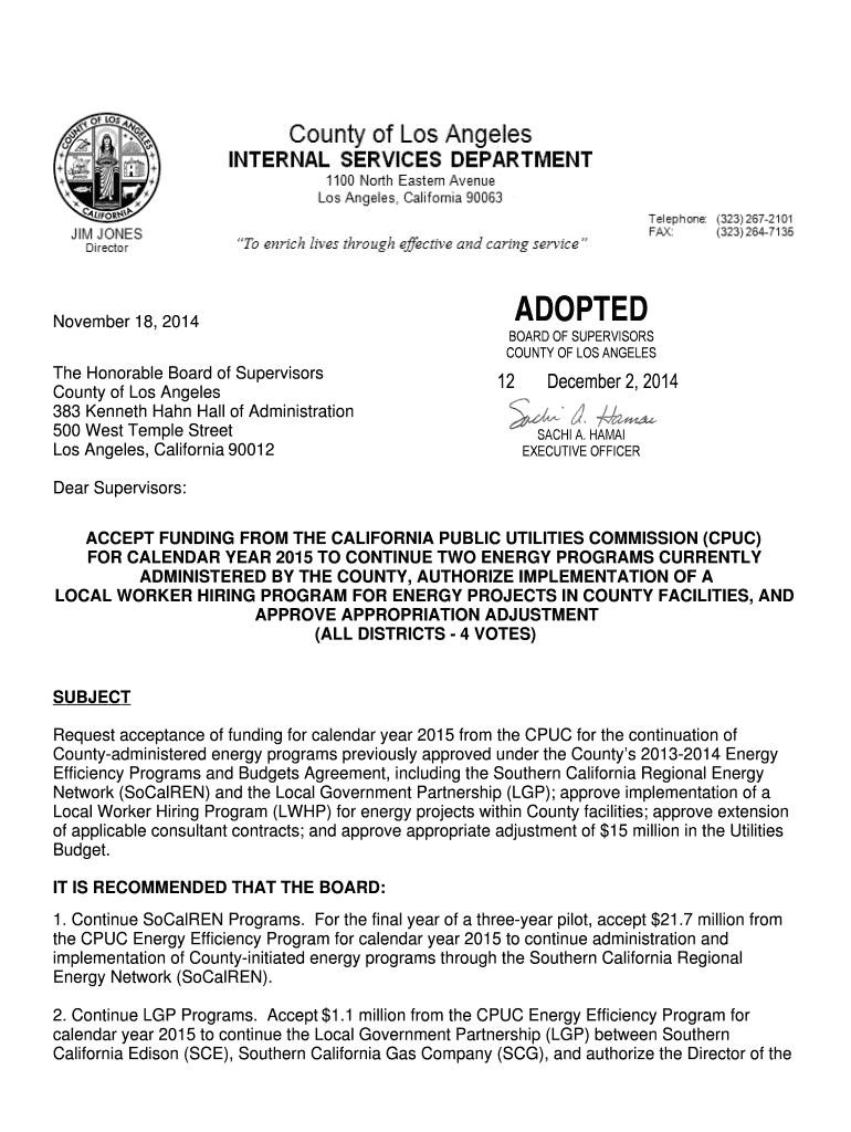 Get the free November 18, 2014 The Honorable Board of Supervisors County ... - file lacounty