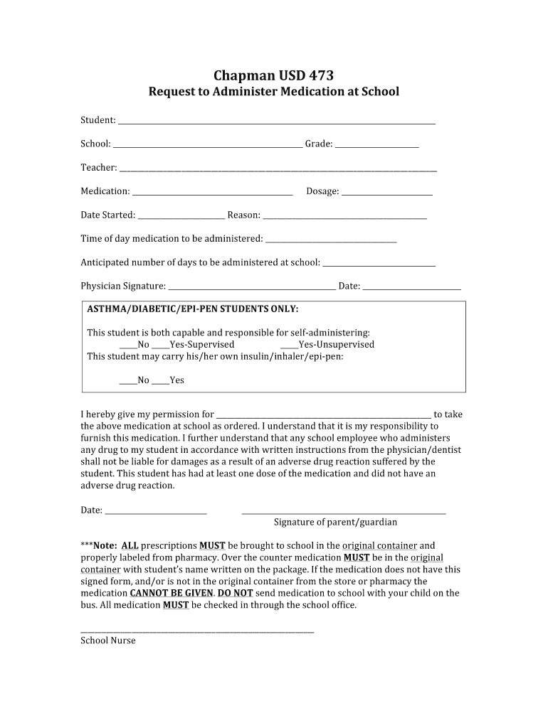 Chapman USD 473Request to Administer Medication at SchoolStudent: School: Grade: Teacher: Medication: Dosage: Date Started: Reason: Time of day medication to be administered: Anticipated number of