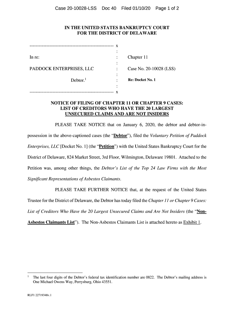 Case 2010028LSSDoc 40Filed 01/10/20Page 1 of 2IN THE UNITED STATES BANKRUPTCY COURT FOR THE DISTRICT OF DELAWARE x : In re: : : PADDOCK ENTERPRISES, LLC : : 1 Debtor. Chapter 11 Case No. 2010028