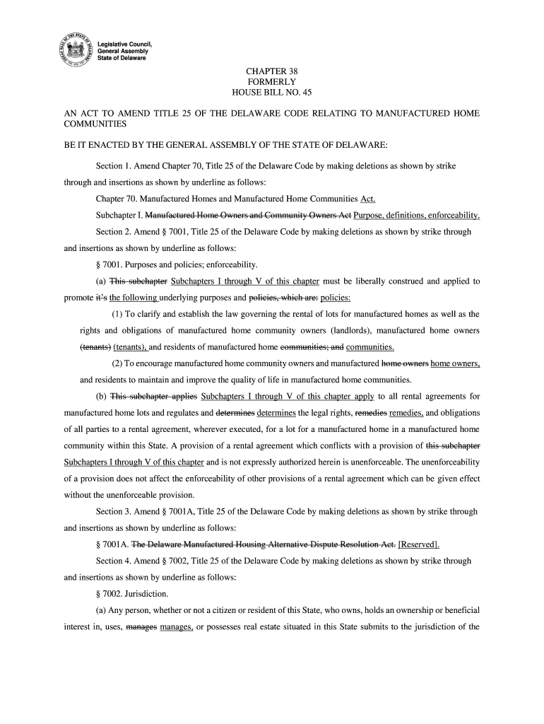 AN ACT TO AMEND TITLE 25 OF THE DELAWARE CODE RELATING TO MANUFACTURED HOME