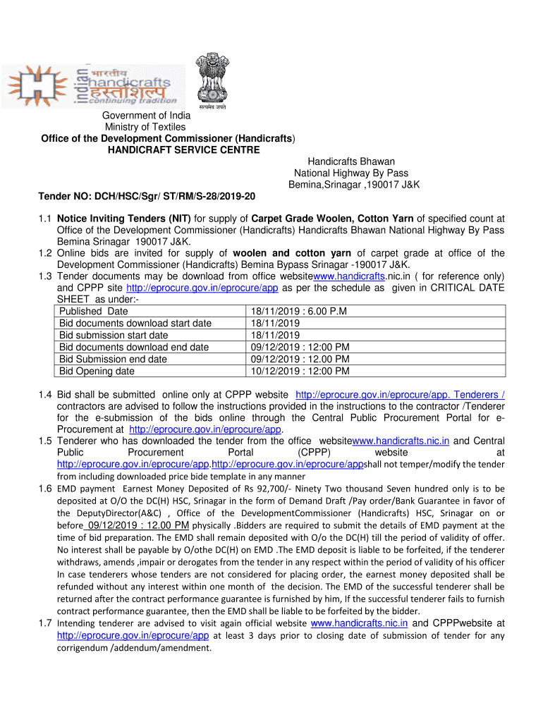 Government of India Ministry of Textiles Office of the Development Commissioner (Handicrafts) HANDICRAFT SERVICE Center Handicrafts Shawn National Highway By Pass Being, Srinagar, 190017 J&K Tender