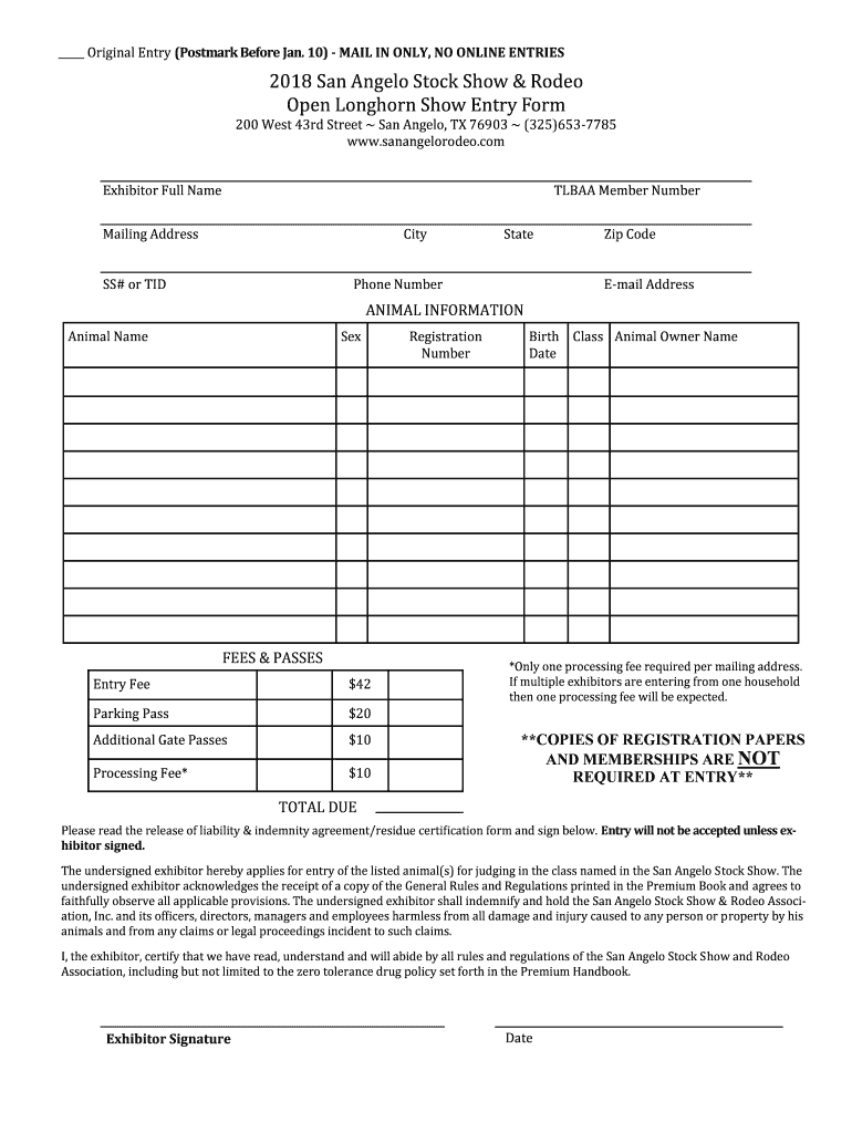 Original Entry (Postmark Before Jan. 10) MAIL IN ONLY, NO ONLINE ENTRIES2018 San Angelo Stock Show & Rodeo Open Longhorn Show Entry Form 200 West 43rd Street San Angelo, TX 76903 (325)6537785 www.sanangelorodeo.com