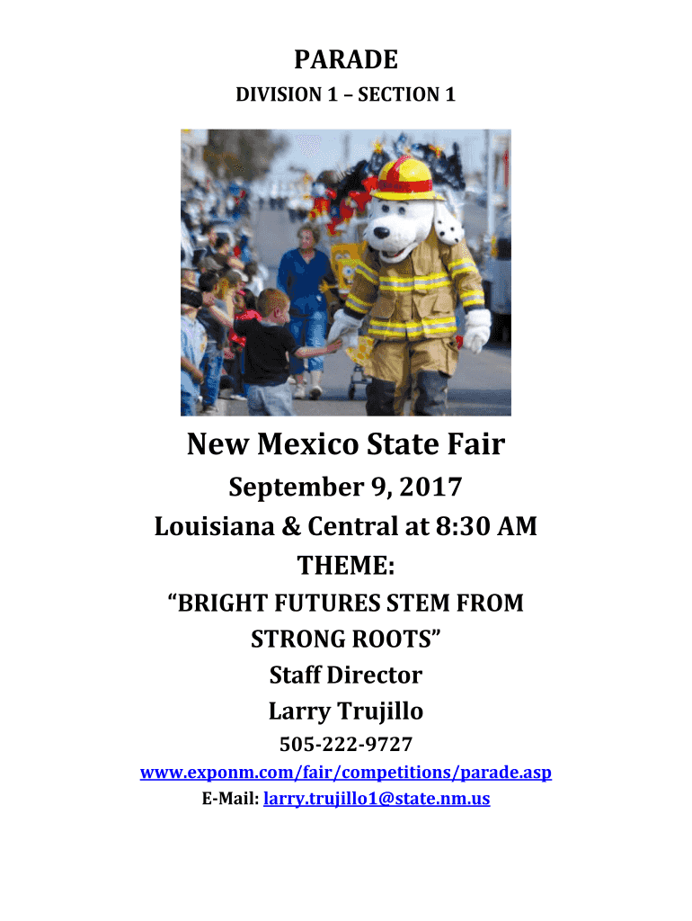 PARADE DIVISION 1 SECTION 1New Mexico State Fair September 9, 2017, Louisiana & Central at 8:30 AM THEME: BRIGHT FUTURES STEM FROM STRONG ROOTS Staff Director Larry Trujillo 5052229727 www.exponm.com/fair/competitions/parade.asp