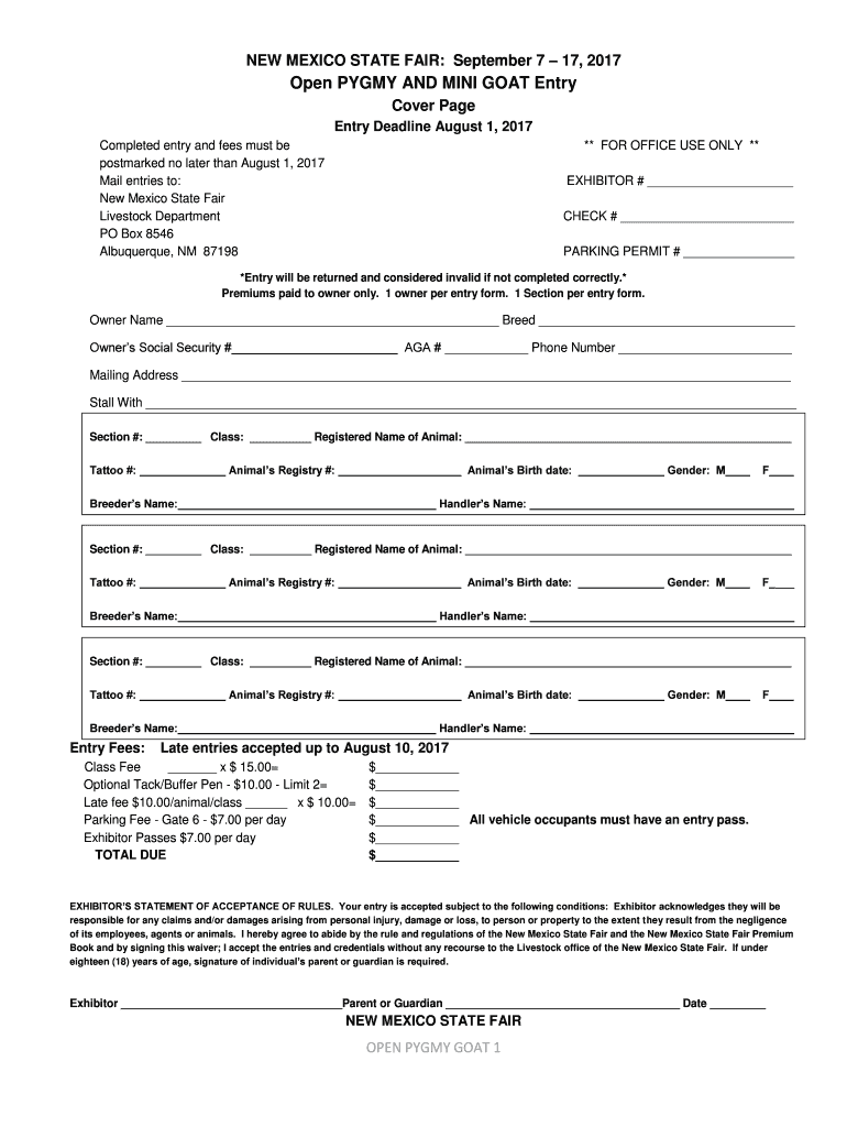 NEW MEXICO STATE FAIR: September 7 17, 2017Open PYGMY AND MINI GOAT Entry Cover Page Entry Deadline August 1, 2017, Completed entry and fees must be postmarked no later than August 1, 2017, Mail entries
