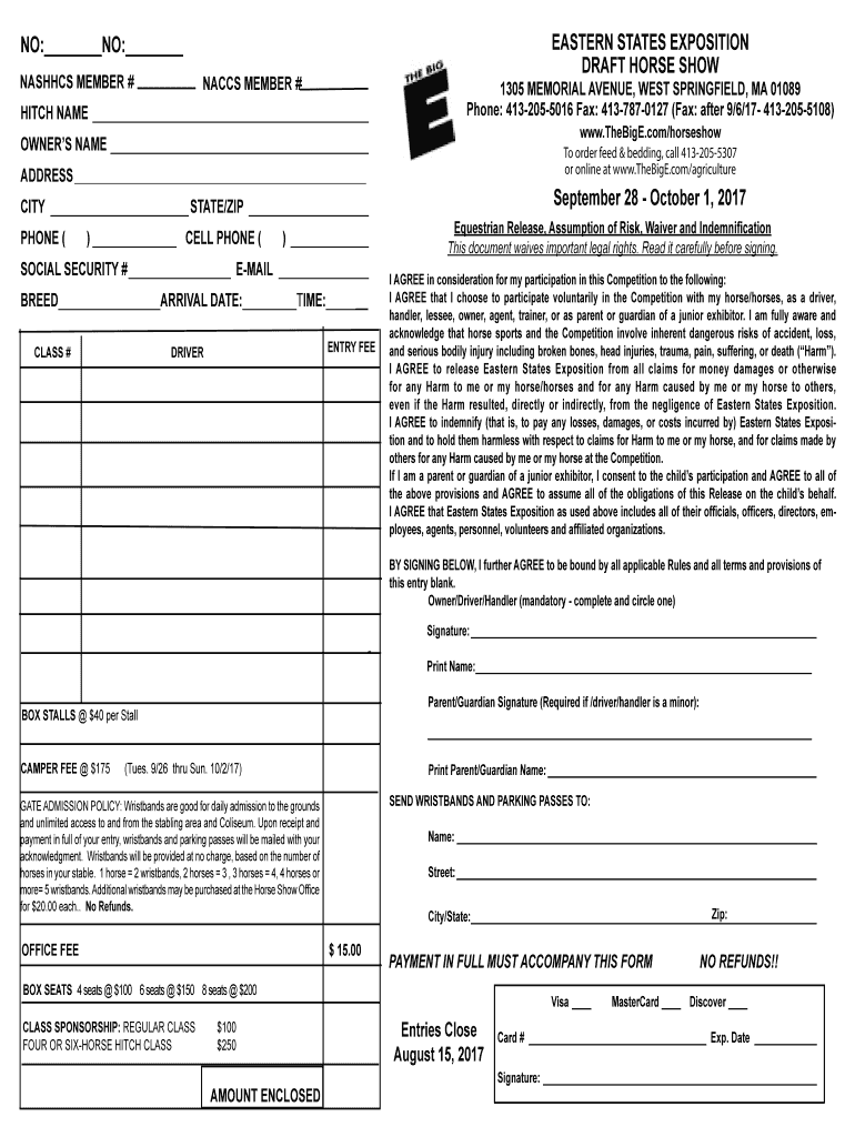 EASTERN STATES EXPOSITION DRAFT HORSE SHOWN: NO: NASH MEMBER #NARCS MEMBER #1305 MEMORIAL AVENUE, WEST SPRINGFIELD, MA 01089 Phone: 4132055016 Fax: 4137870127 (Fax: after 9/6/17 4132055108)Hitch Name