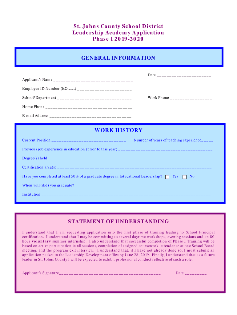 St. Johns County School DistrictLeadership Academy ApplicationPhase I 20192020GENERAL INFORMATION Date Applicants Name Employee ID Number (EO.) School/Department Work Phone Home Phone Email Address