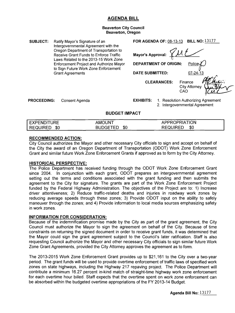 Beaverton City CouncilBeaverton, OregonSUBJECT:Ratify Mayor\'s Signature of an