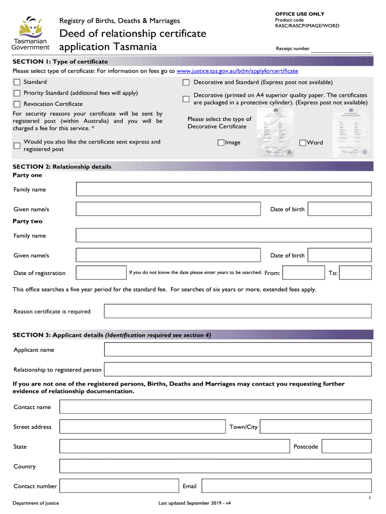 OFFICE USE ONLY Product code RISC/RASP/IMAGE/WORDRegistry of Births, Deaths & MarriagesDeed of relationship certificate application TasmaniaReceipt numberSECTION 1: Type of certificate Please select