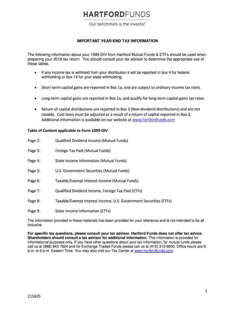 IMPORTANT YEAREND TAX Information following information about your 1099DIV from Hartford Mutual Funds & ETFs should be used when preparing your 2019 tax return. You should consult your tax advisor