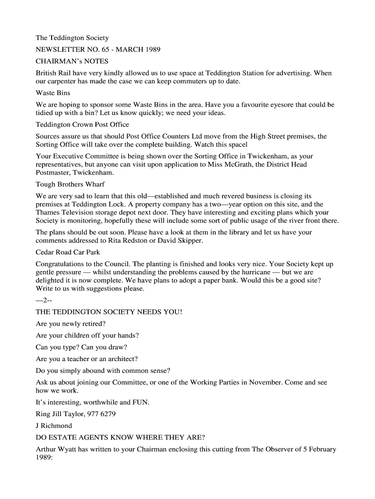 The Eddington Society NEWSLETTER NO. 65 MARCH 1989 Chairman NOTES British Rail have very kindly allowed us to use space at Eddington Station for advertising. When our carpenter has made the case we