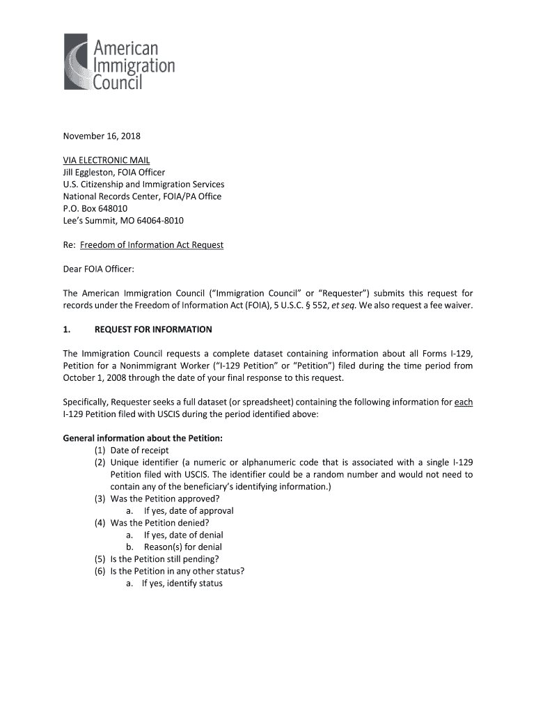 November 16, 2018, VIA ELECTRONIC MAIL Jill Galveston, FOIA Officer U.S. Citizenship and Immigration Services National Records Center, FOIA/PA Office P.O. Box 648010 Lees Summit, MO 640648010 Re: