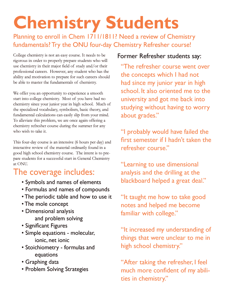 fundamentals? Try the ONU four day Chemistry Refresher course!