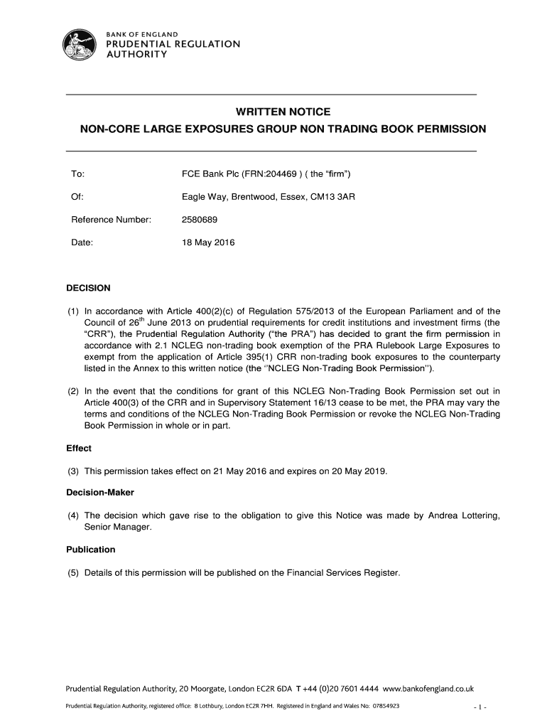 WRITTEN NOTICE CONCORD LARGE EXPOSURES GROUP NON TRADING BOOK PERMISSION To:FCE Bank Plc (FAN:204469) (the firm)Of:Eagle Way, Brentwood, Essex, CM13 3ARReference Number:2580689Date:18 May 2016DECISION