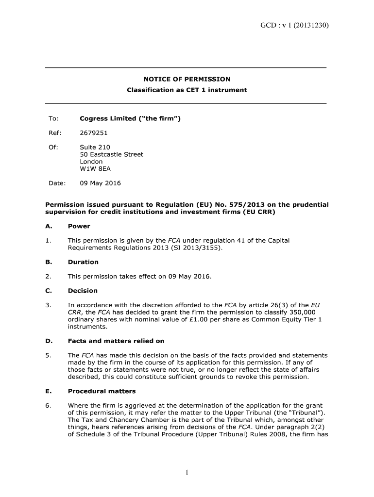 CD : v 1 (20131230) NOTICE OF PERMISSION Classification as CET 1 instrument To:Congress Limited (the firm)Ref:2679251Of:Suite 210 50 East castle Street London W1W 8EADate:09 May 2016Permission issued
