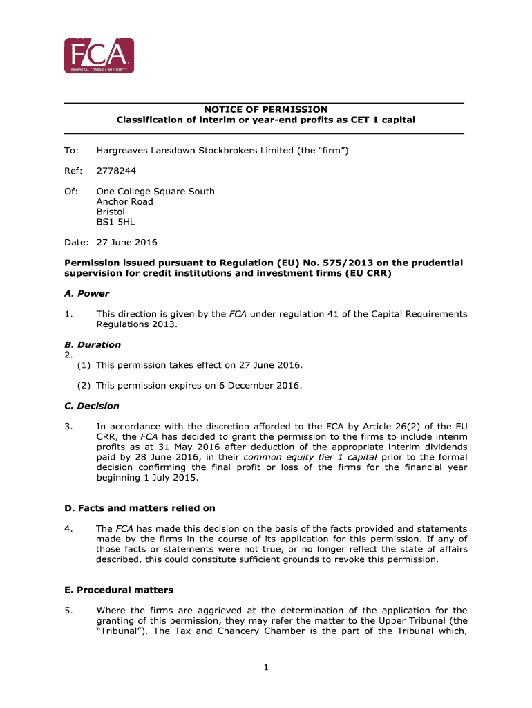 NOTICE OF PERMISSION Classification of interim or yearend profits as CET 1 capital To:Hargreaves Landon Stockbrokers Limited (the firm)Ref:2778244Of:One College Square South Anchor Road Bristol BS1