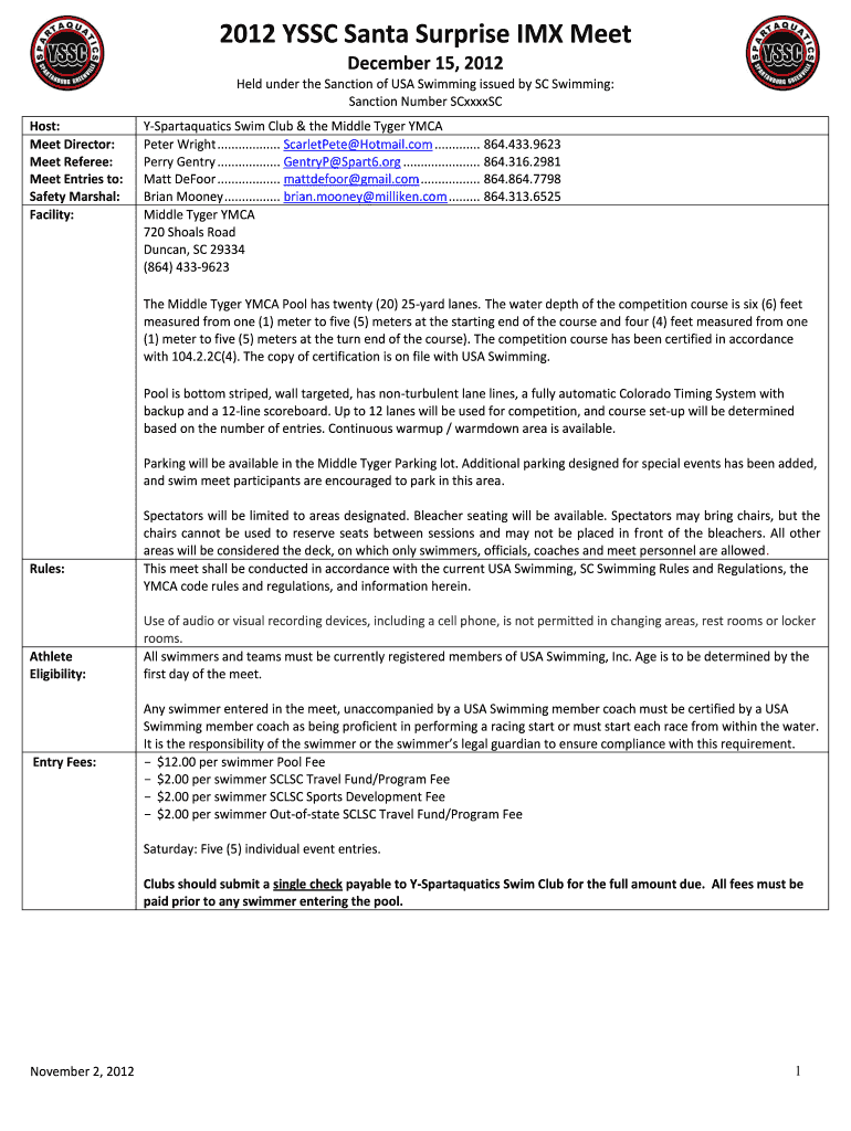 2012 SSC Santa Surprise IMF Meet December 15, 2012, Held under the Sanction of USA Swimming issued by SC Swimming: Sanction Number SCxxxxSC Host: Meet Director: Meet Referee: Meet Entries to: Safety