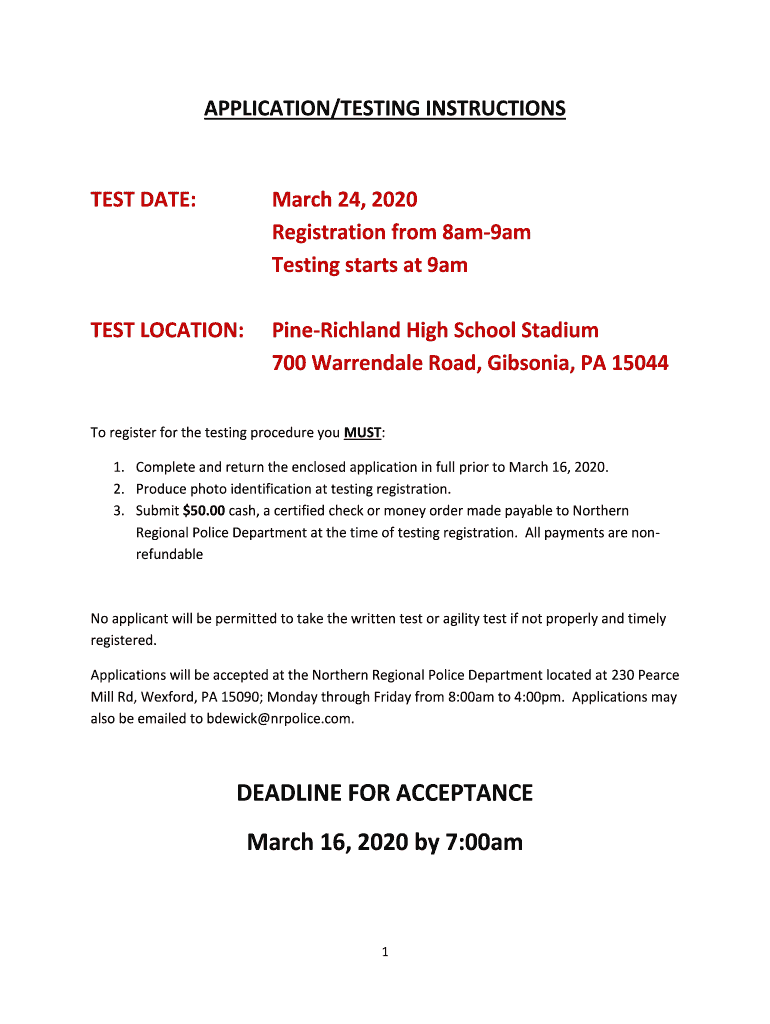 Testing starts at 9amTEST LOCATION:PineRichland High School Stadium