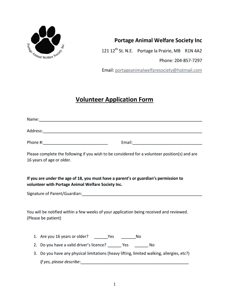 Email: portageanimalwelfaresociety@hotmail.comVolunteer Application Form