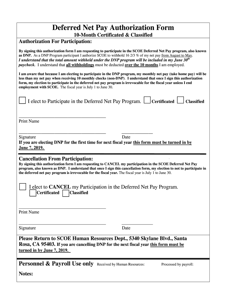 Deferred Net Pay Authorization Form 10Month Certificated & Classified Authorization For Participation: By signing this authorization form I am requesting to participate in the SCORE Deferred Net Pay