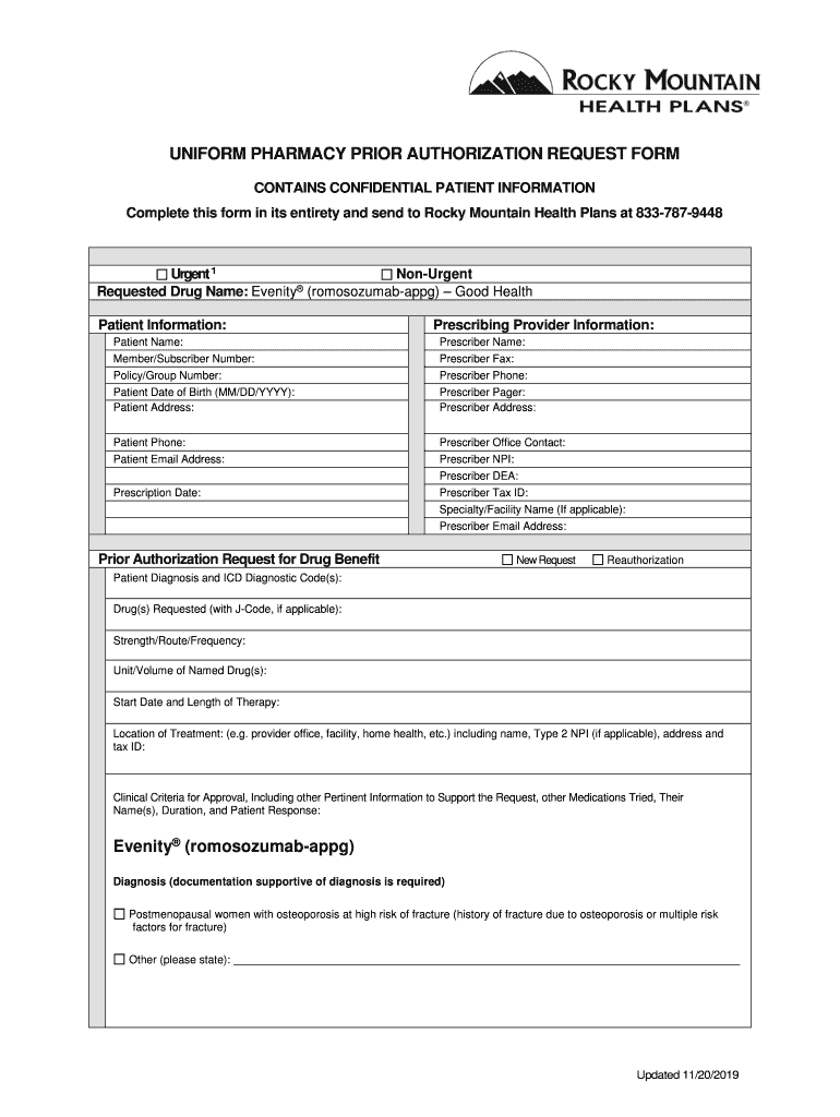 UNIFORM PHARMACY PRIOR AUTHORIZATION REQUEST FORM CONTAINS CONFIDENTIAL PATIENT INFORMATION Complete this form in its entirety and send to Rocky Mountain Health Plans at 8337879448Urgent 1 Monument