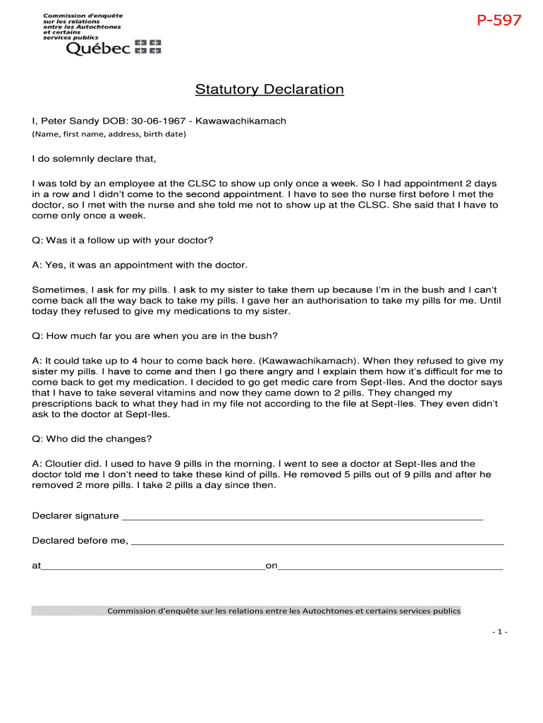 P597Statutory Declaration I, Peter Sandy DOB: 30061967 Kawawachikamach (Name, first name, address, birthdate)I do solemnly declare that, I was told by an employee at the CLSC to show up only once