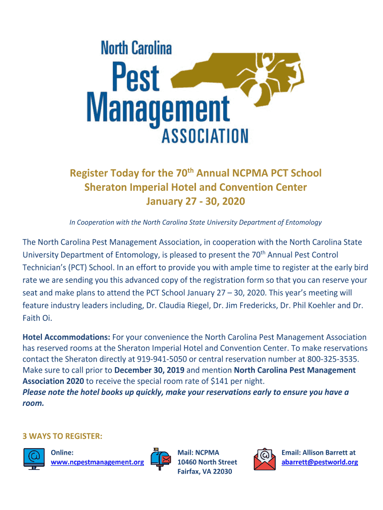 Register Today for the 70th Annual NC PMA PCT School Sheraton Imperial Hotel and Convention Center January 27 30, 2020 In Cooperation with the North Carolina State University Department of Entomology
